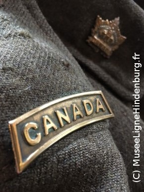 Tunique "P02" pour "pattern 1902" toile de laine kaki équipant les troupes britanniques et plus largement la grande majorité des troupes du Commonwealth (excepté les officiers, les troupes écossaises kiltées, ou les troupes Australiennes par exemple). Ici cet exemplaire fabriqué à Montréal, porte les attributs des troupes Canadiennes. Cette tunique sera utilisée durant toute la durée du conflit sans modification majeure. Et, elle est, contrairement par exemple, aux uniformes Français (capote gris de fer bleuté et pantalon rouge garance), dès l'entrée en guerre, adaptés aux conditions imposés par les combats modernes de la Guerre de 14-18 notamment grâce à la couleur kaki hérité des expériences coloniales qui se fond bien mieux dans le décor du noman's land qu'un pantalon rouge garance. Ce modèle subira quelques modifications mineures en 1922 pour un usage (minoritaire) lors de la Deuxième Guerre Mondiale. Au combat, pour ce qui est des officiers, afin de mieux se mêler aux troupes lors des assauts, et ainsi éviter d'être visés les premiers, il leur était permis de porter cette tunique à la place ou par-dessus les effets normalement réservés à leur grade (tunique en tissu différent, teinte parfois plus claire et coupe totalement différente, grades très visibles à l'avant des manches qui seront ensuite déportés aux épaules pour plus de discrétion).