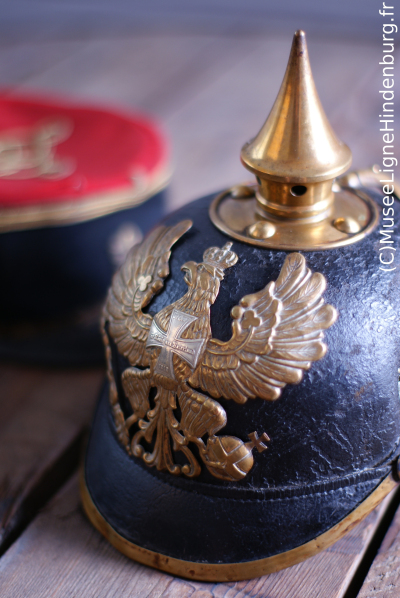 Casque à pointe de réserviste Prusse. Cuir bouilli vernis noir et attributs en laiton. La plaque frontale représente ici l'aigle prussien surmonté d'une croix de malte en métal blanc qui caractérise les troupes de réserve. En 1914, les réservistes renforcent les 50 divisions constituant l'armée allemande en temps de paix pour passer à 105 divisions en Aout 1914. Revenons à notre casque à pointe : La pointe si emblématique de ce casque, indissociable de la silhouette du soldat allemand d'entrée de guerre, sert d'aérateur d'une part et est sensée dévier les coups de sabres portés à la tête. Très voyant et peu protecteur, il sera rapidement couvert d'un couvre casque en toile afin de masquer les reflets, puis il sera définitivement remplacé par le stahlhelm (casque en acier) en 1916 protégeant nettement mieux son porteur face aux éclats d'obus et autres balles perdues ou projectiles divers.