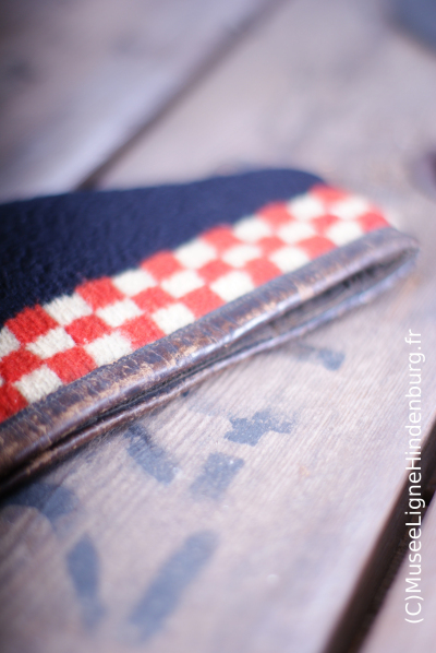 Laine marine, doublure noire toile fine, damier rouge et blanc, bordure cuir, petit pompon laine rouge (toory).