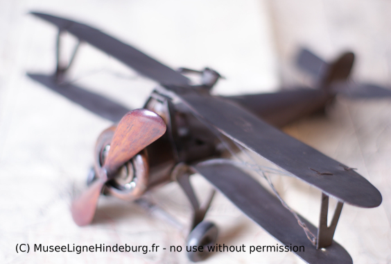 La tôle de cuivre utilisée pour cet maquette (ailes) est très probablement issue de douille d'obus très utilisées en matière première d'art de tranchée, on les trouve d'ailleurs très souvent encore de nos jours entières, sculptées ou ciselées, tonnant sur les rebords de cheminées des grands parents... c'est encore très courrant